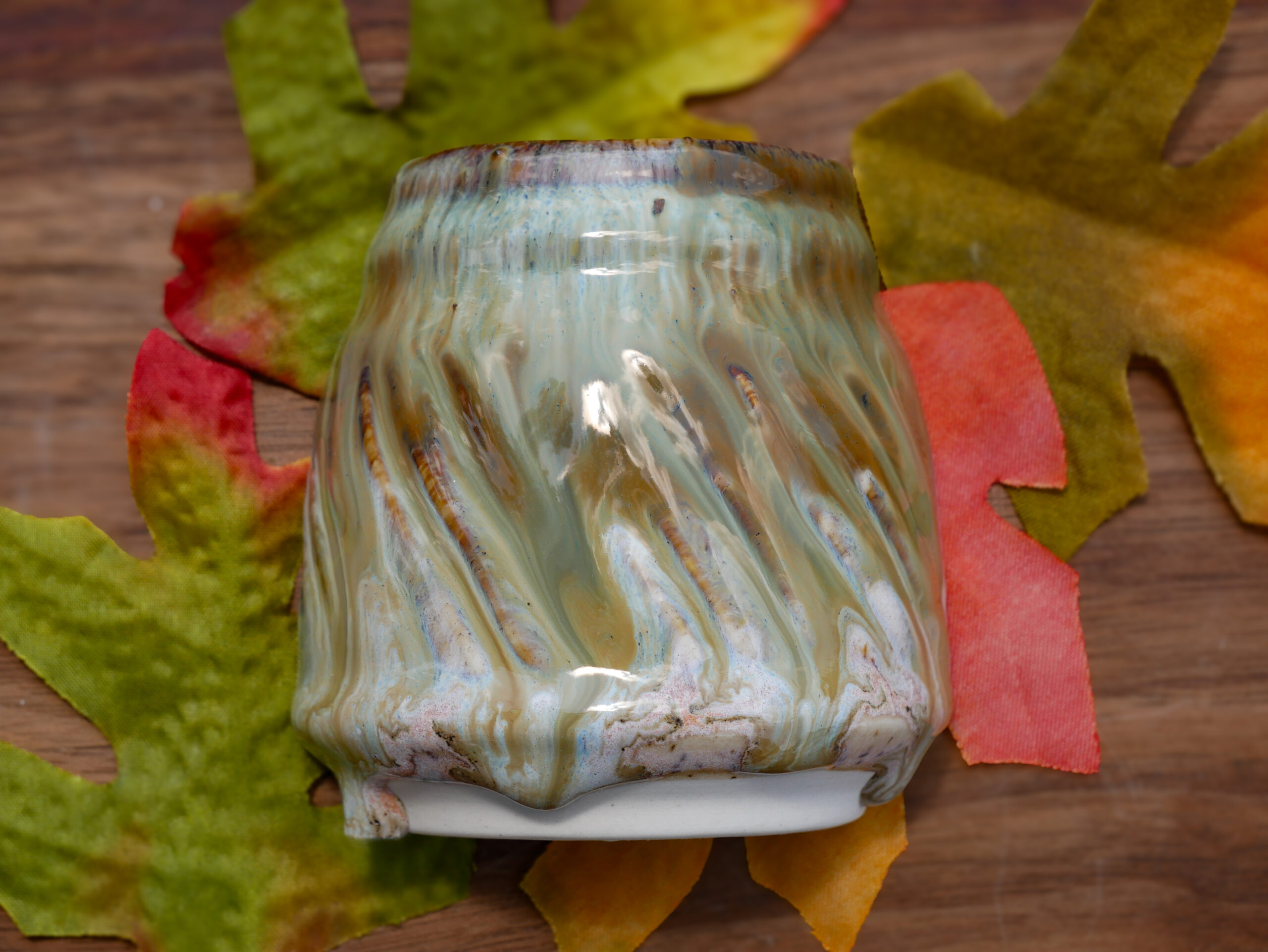 The moon jar pictured is PCF-03 Midnight Run over PCF-16 Aurora Breeze fired at Cone 6. The other piece is PC-65 Black Aventurine over PCF-16 Aurora Breeze fired at Cone 6.