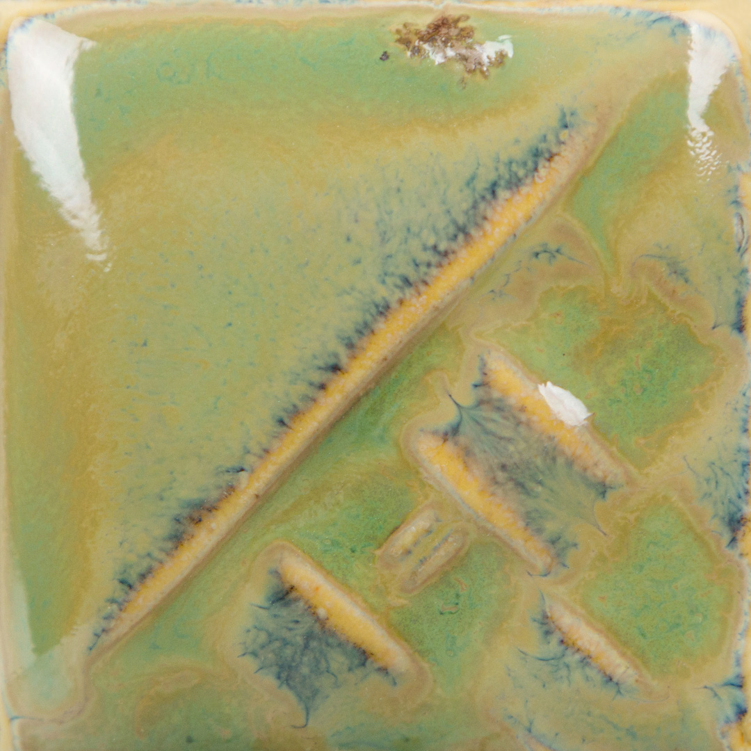 A glossy, opaque green glaze that breaks over texture and has an iridescent sheen. Semi-fluid at 3 coats.