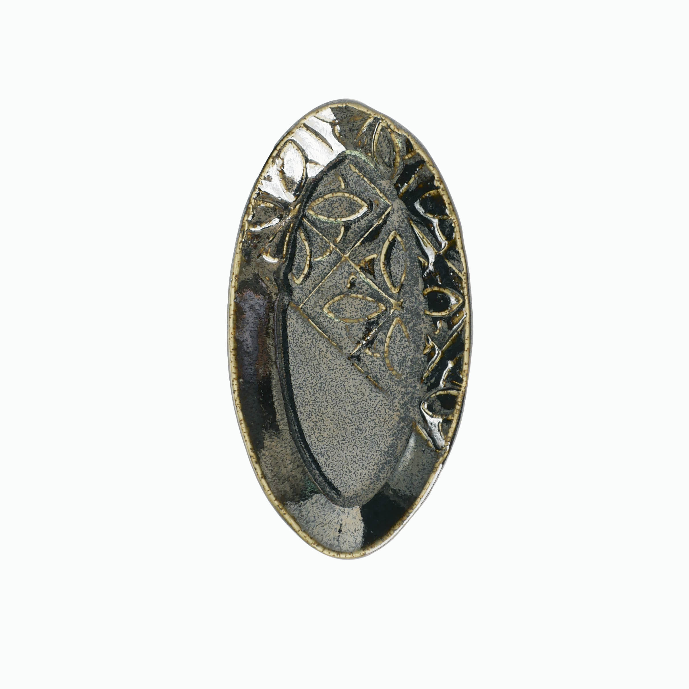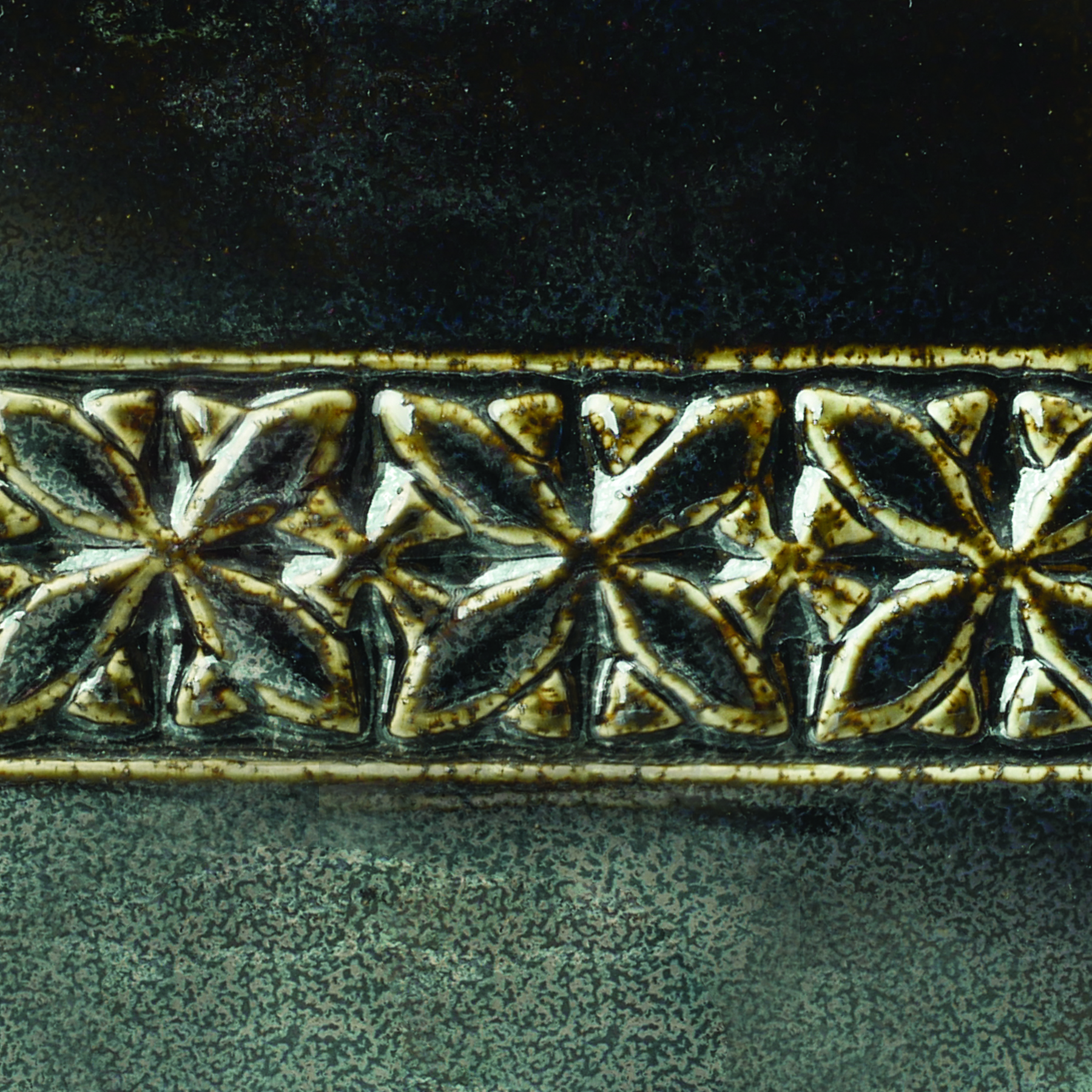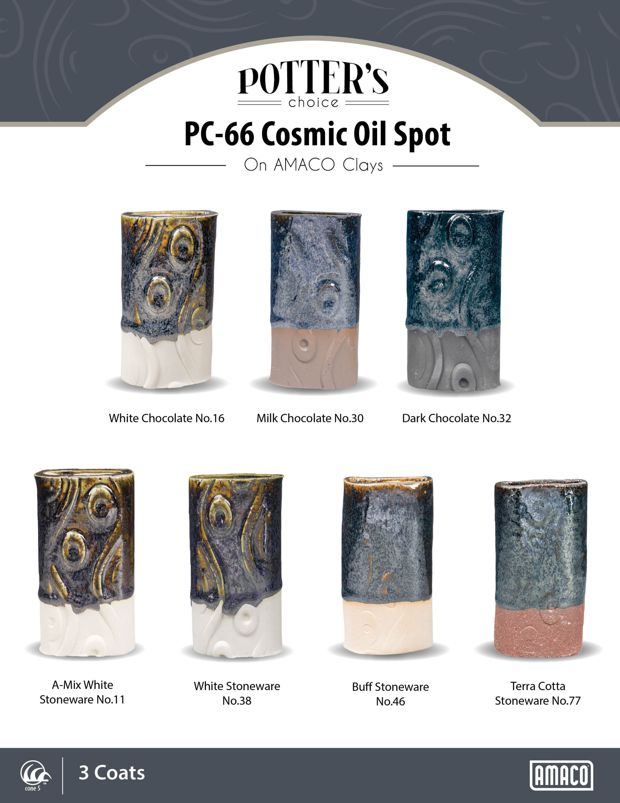 Cosmic Oil Spot is a dark glaze with shimmery flecks that create streams and spots of color similar to a traditional hare’s fur glaze.