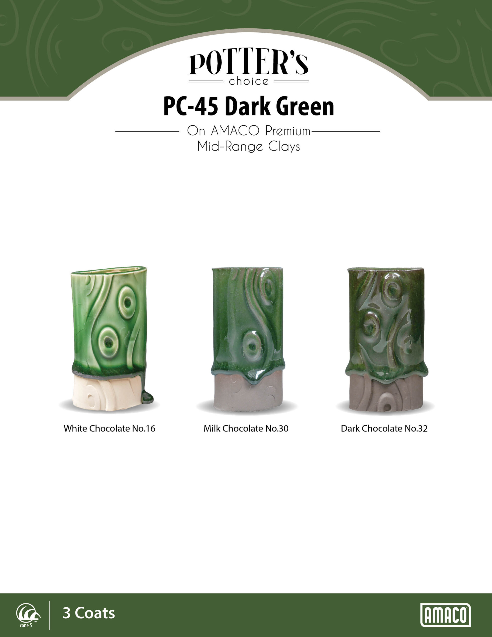 Dark green is a fluid, translucent emerald glaze that shows off textured and carved ware. Use over a wash of our High Fired Texturizer for added definition. Layers well with our other Potter’s Choice glazes!
