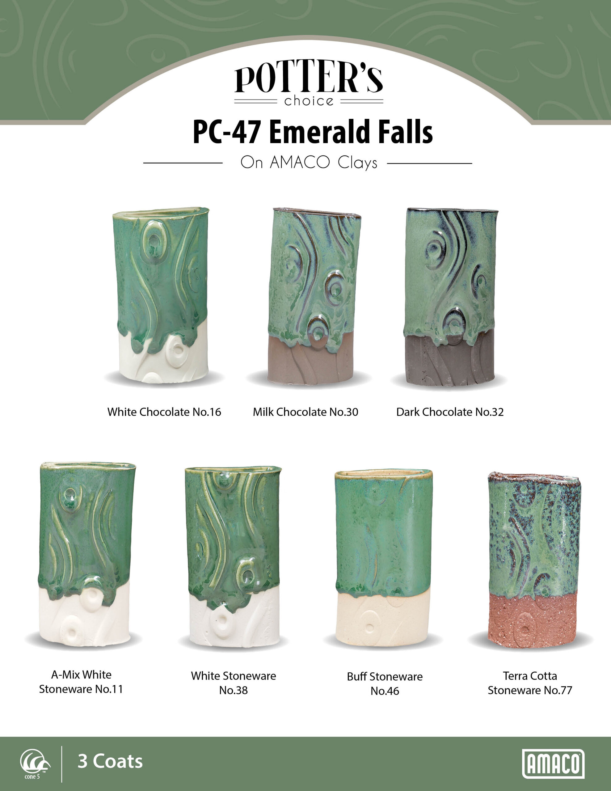 Emerald Falls is a beautiful glossy green glaze that breaks lighter and pools into a mauve grey-green. When heavier coats are applied this allows the glaze to float up and create interesting surface variations echoing mossy patches found in rolling emerald landscapes.