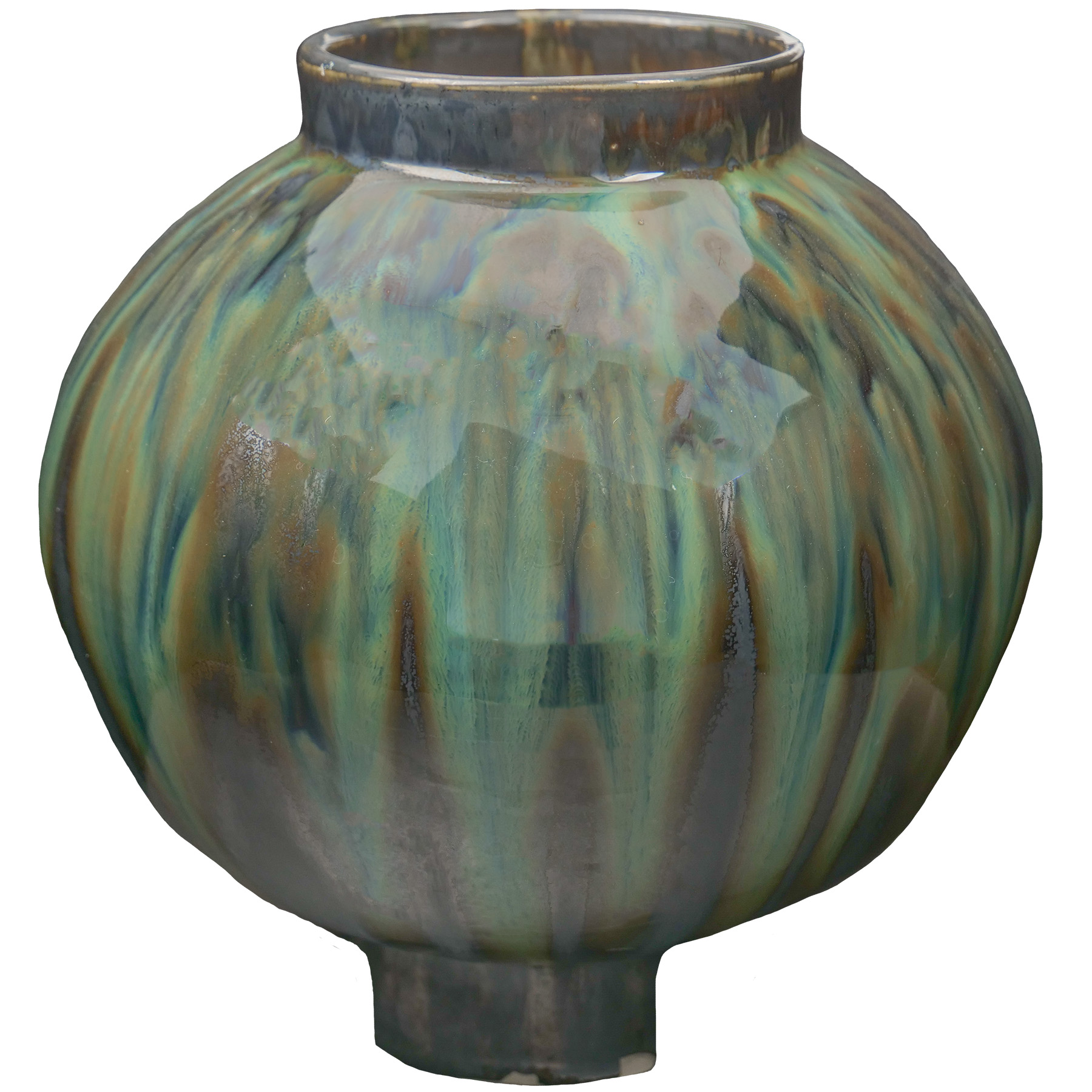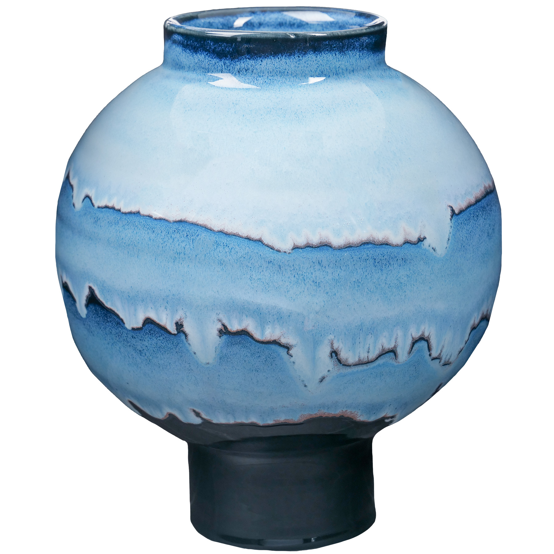 Beautiful on any color of clay. Good at cone 5, more fluid at cone 6. The green moon jar pictured is PCF-18 Honeydew over PC-01 Saturation Metallic fired at Cone 6. The blue moon jar is PCF-18 Honeydew over C-01 Obsidian.