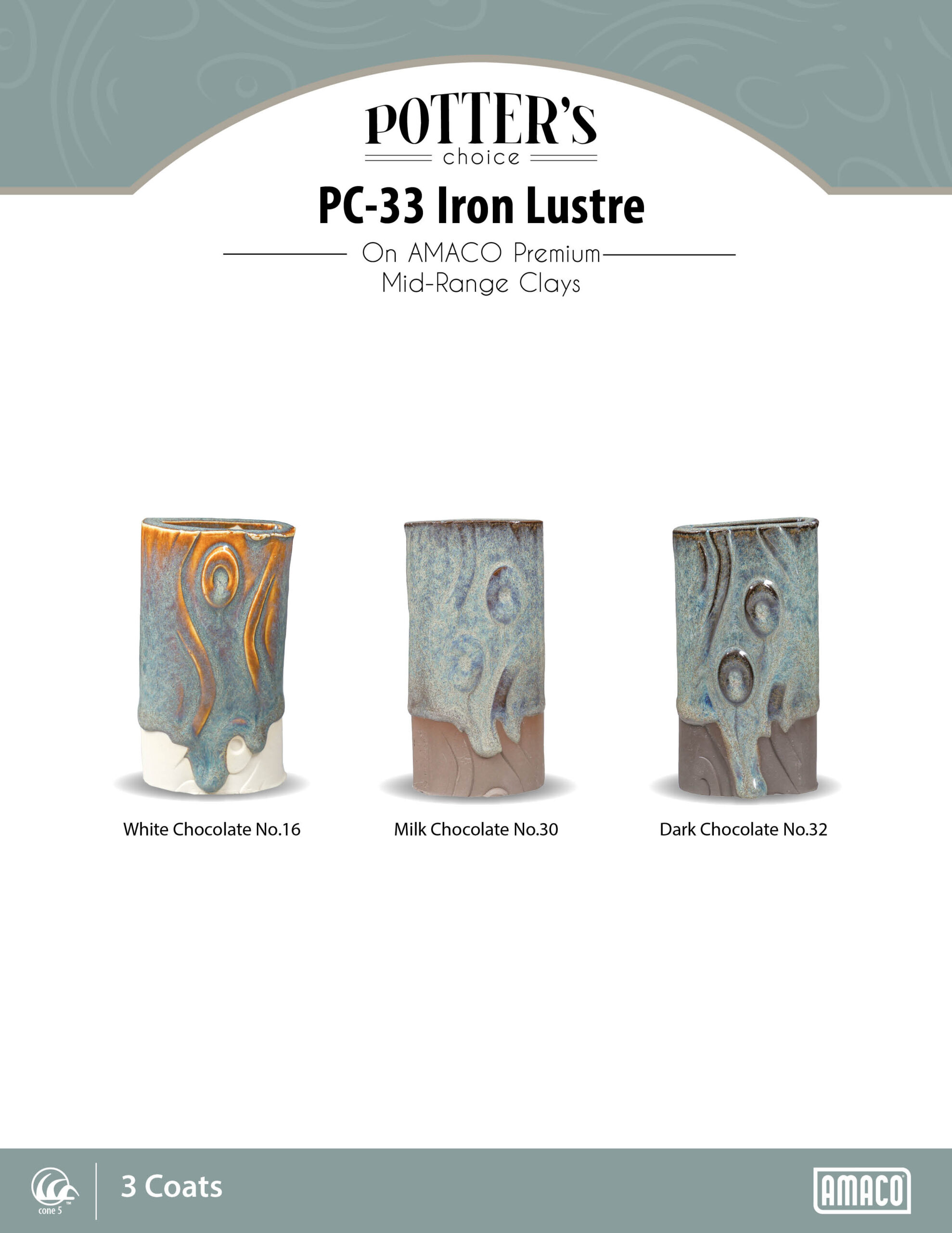 More restrained, but similar to a regular blue glaze, Iron Lustre is brown where thin with blue-gray floats where thick. It is beautiful on texture and layers well with other Potter’s Choice glazes.