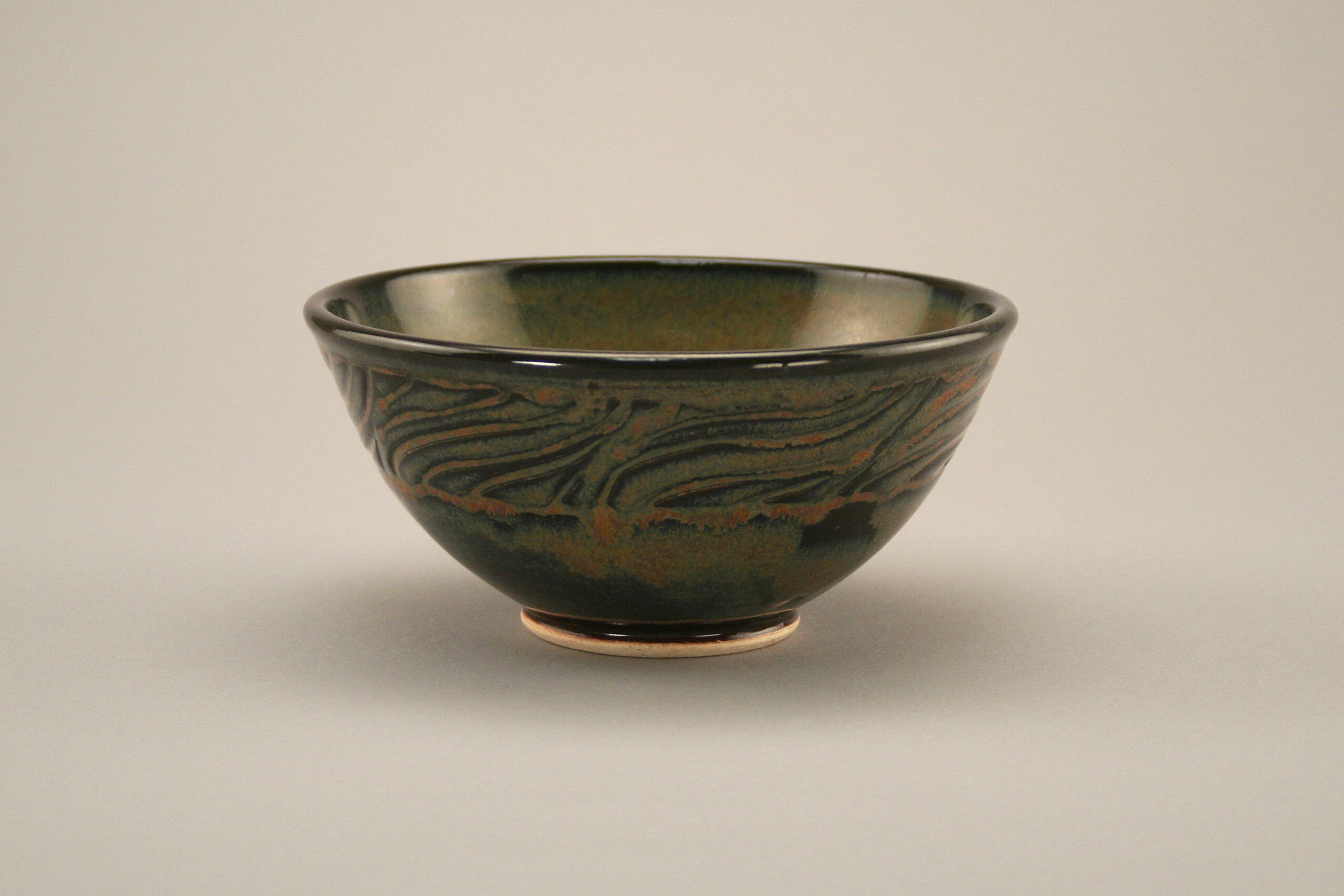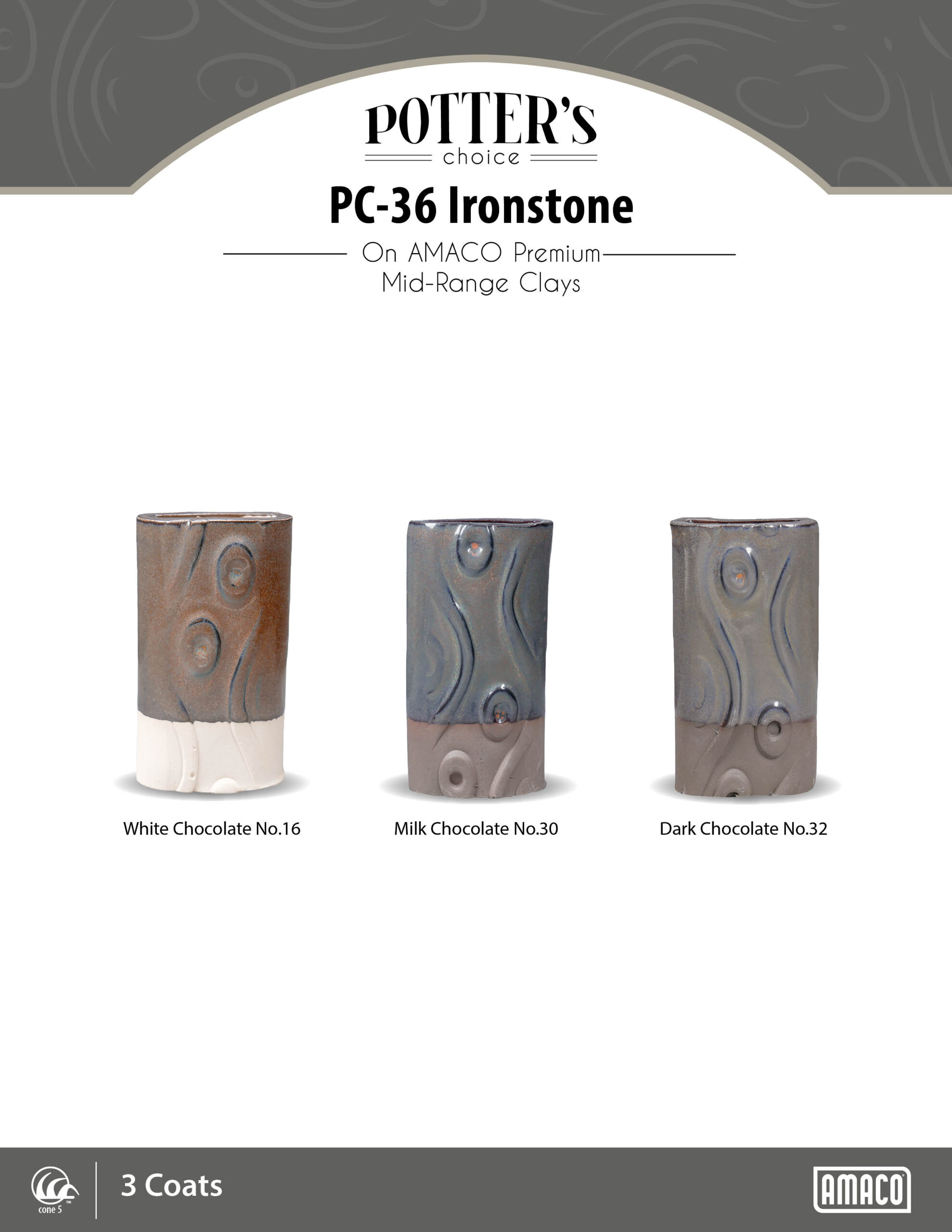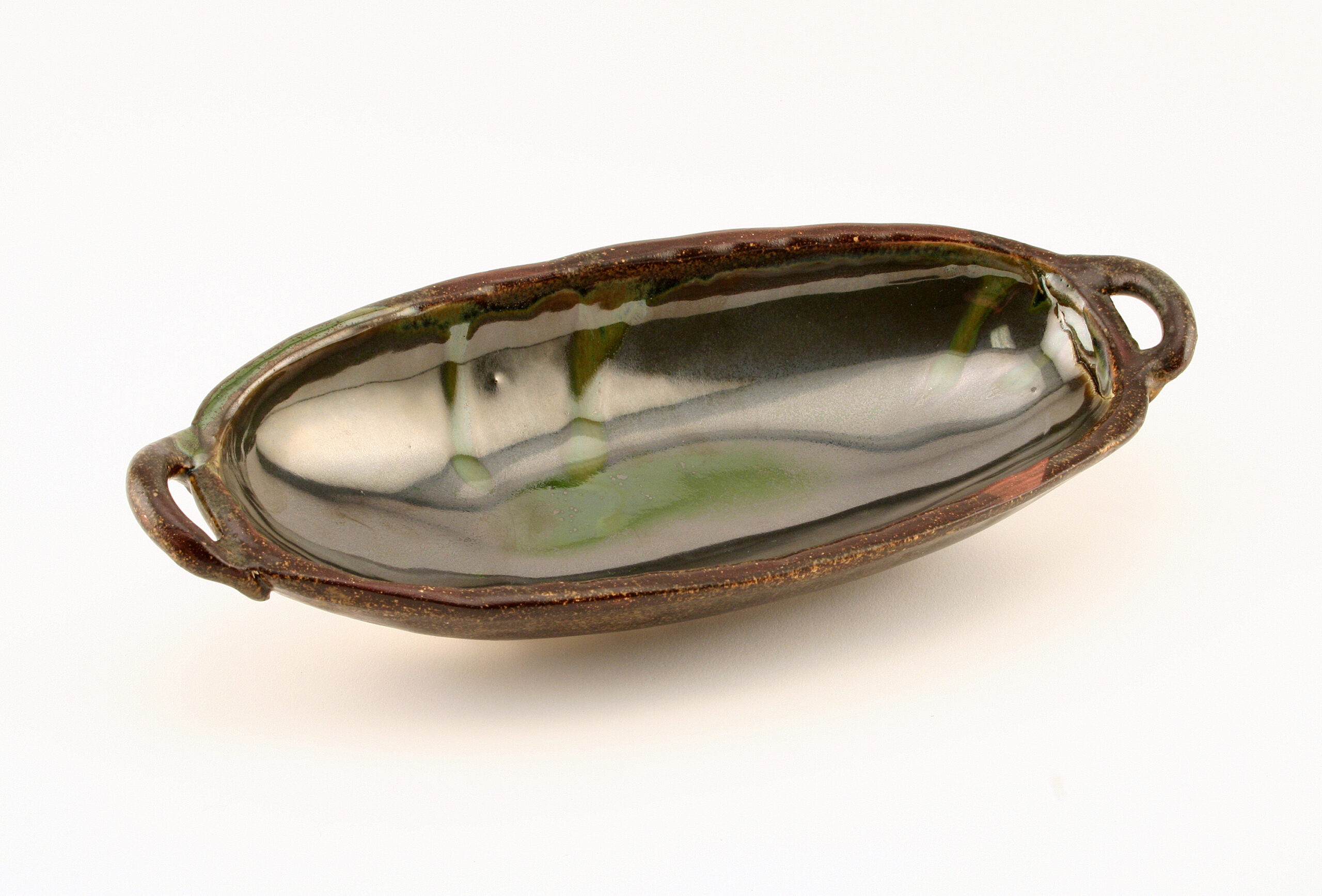 Ironstone is a glossy, dark glaze that is a deep chocolatey brown where thin with a beige-bronze float where thicker. Mixes well with other Potter’s Choice Glazes. The long dish pictured here is Ironstone layered with Seaweed.