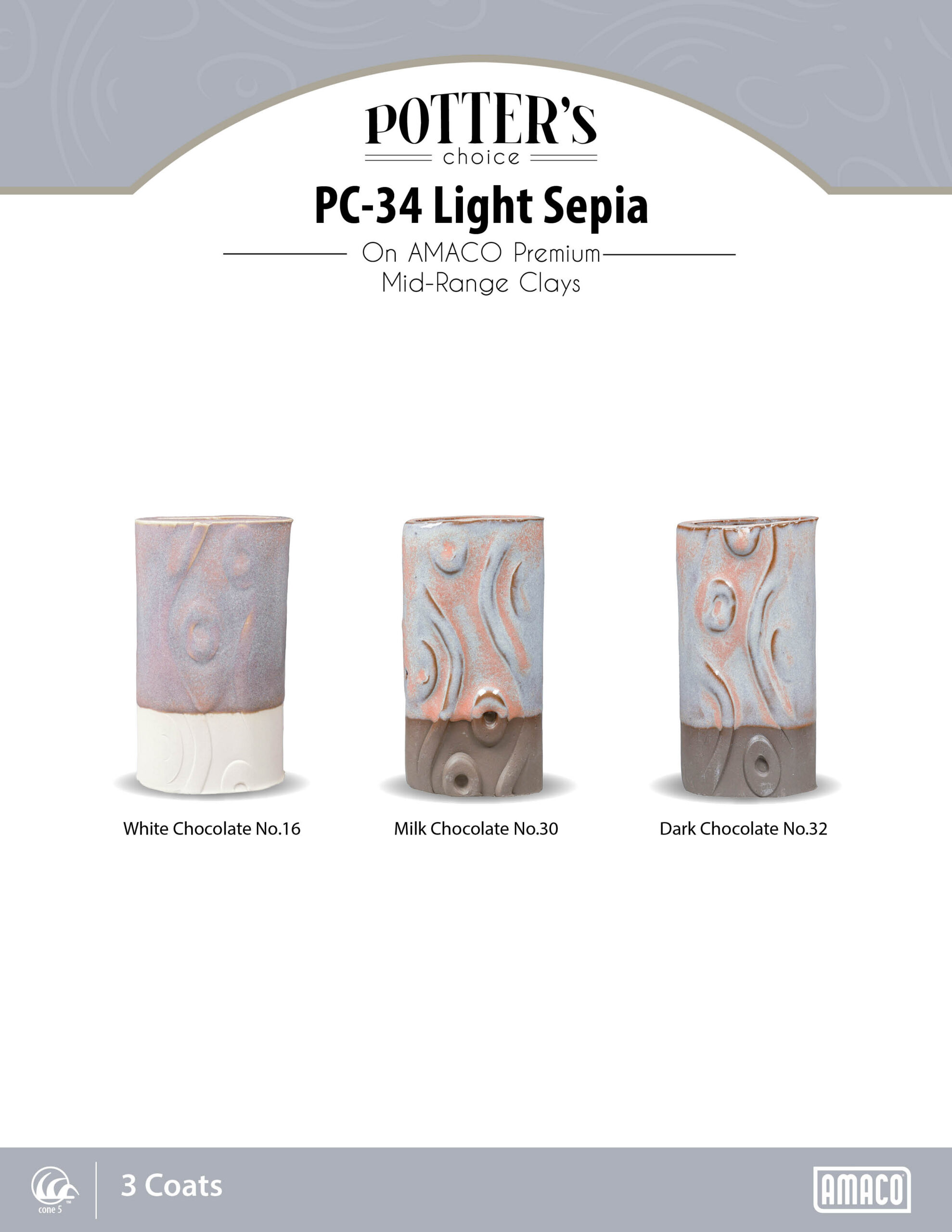 Light Sepia is an opalescent grey glaze that features strong variations on textured ware. This glaze breaks golden beige where thin and lends well to layering with other Potters Choice Glazes.