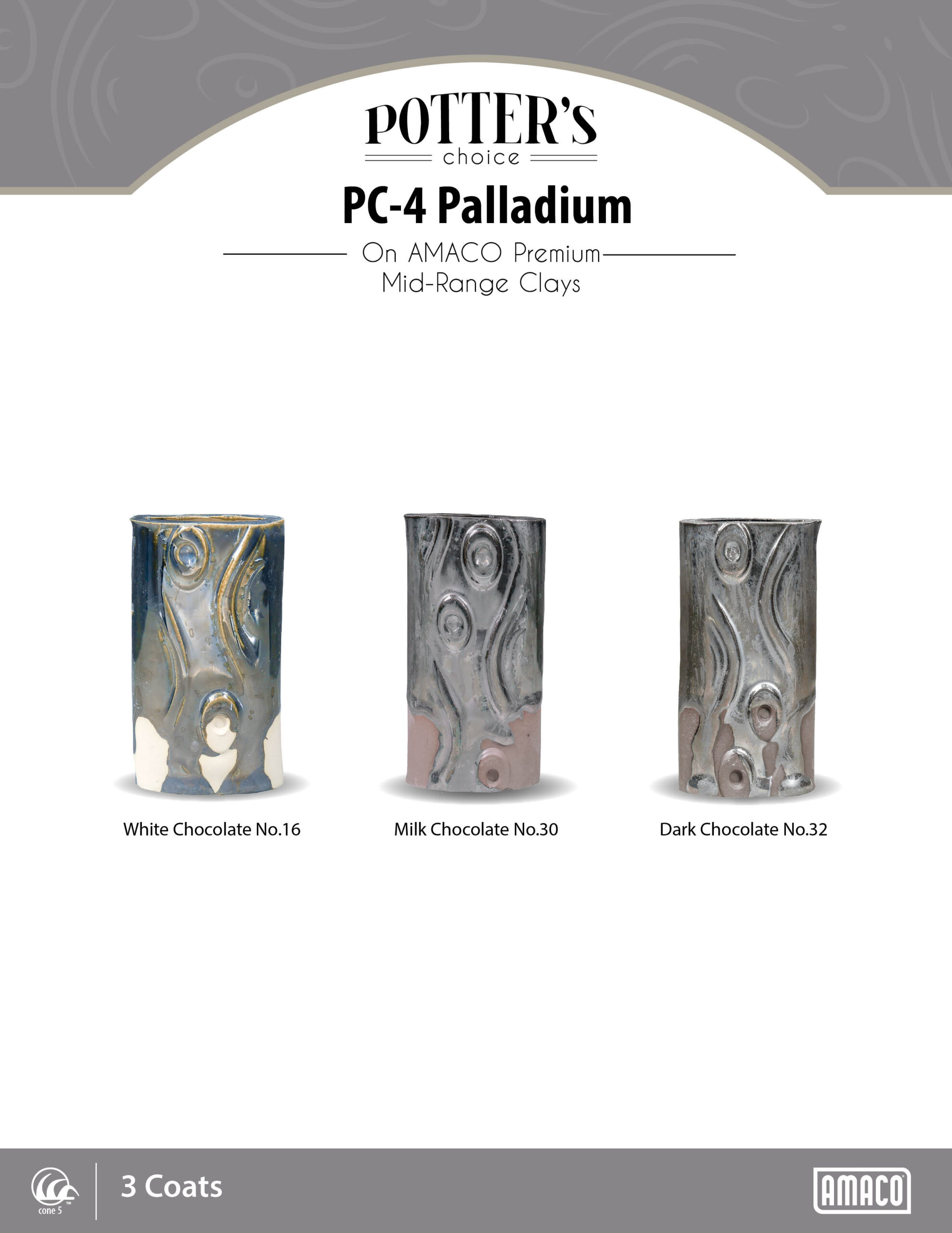 This unique metallic glaze has a mirror-like finish when fired and adds beautiful, shimmering accents to any work. Because it is not food safe, this glaze is perfect for sculptural work that calls for reflective, glassy surfaces. Palladium requires 3 coats to develop the smooth mirror finish. This glaze is fluid so be careful not to overfire. This glaze likes low porosity bodies. It is also great as an accent glaze or for layering with other AMACO glazes.