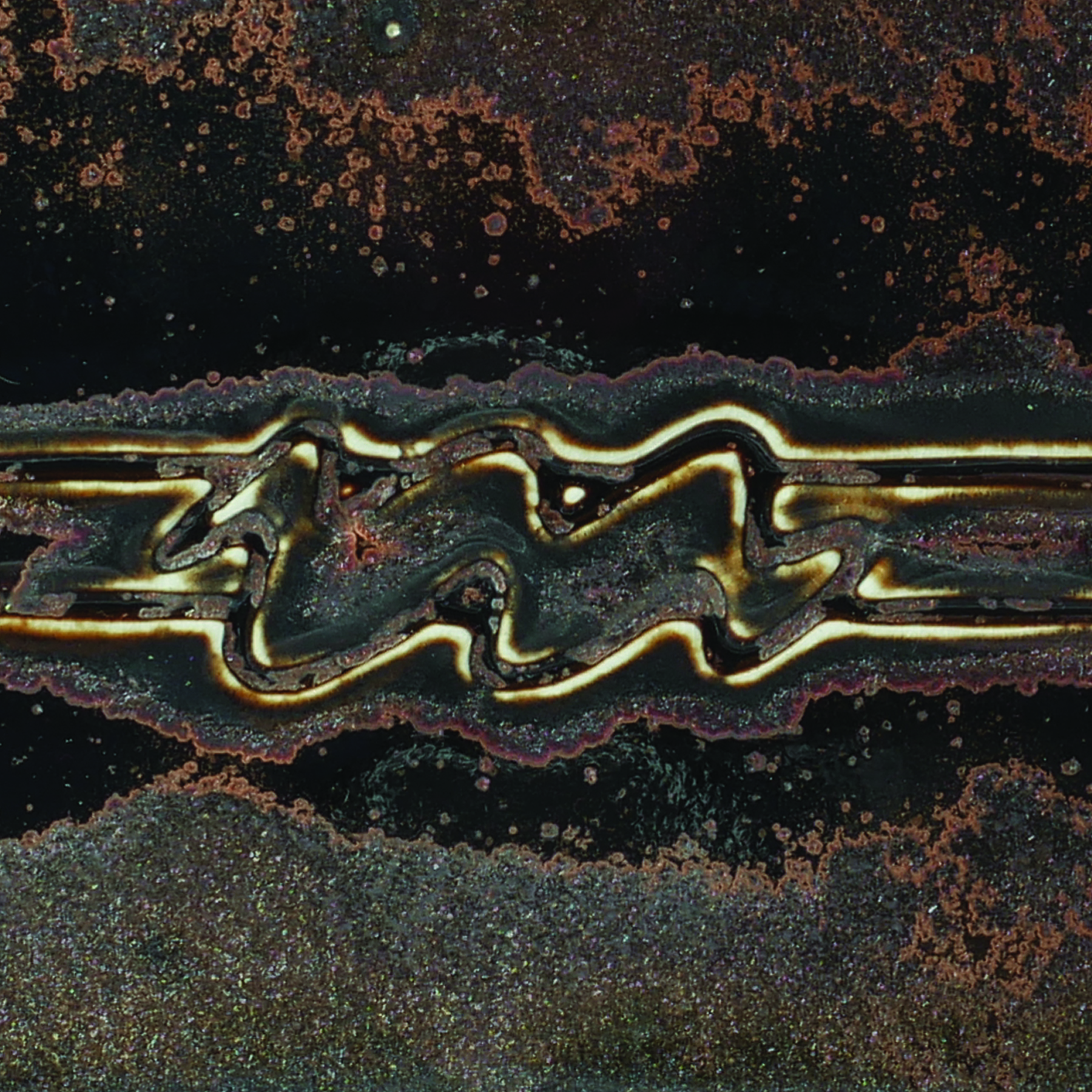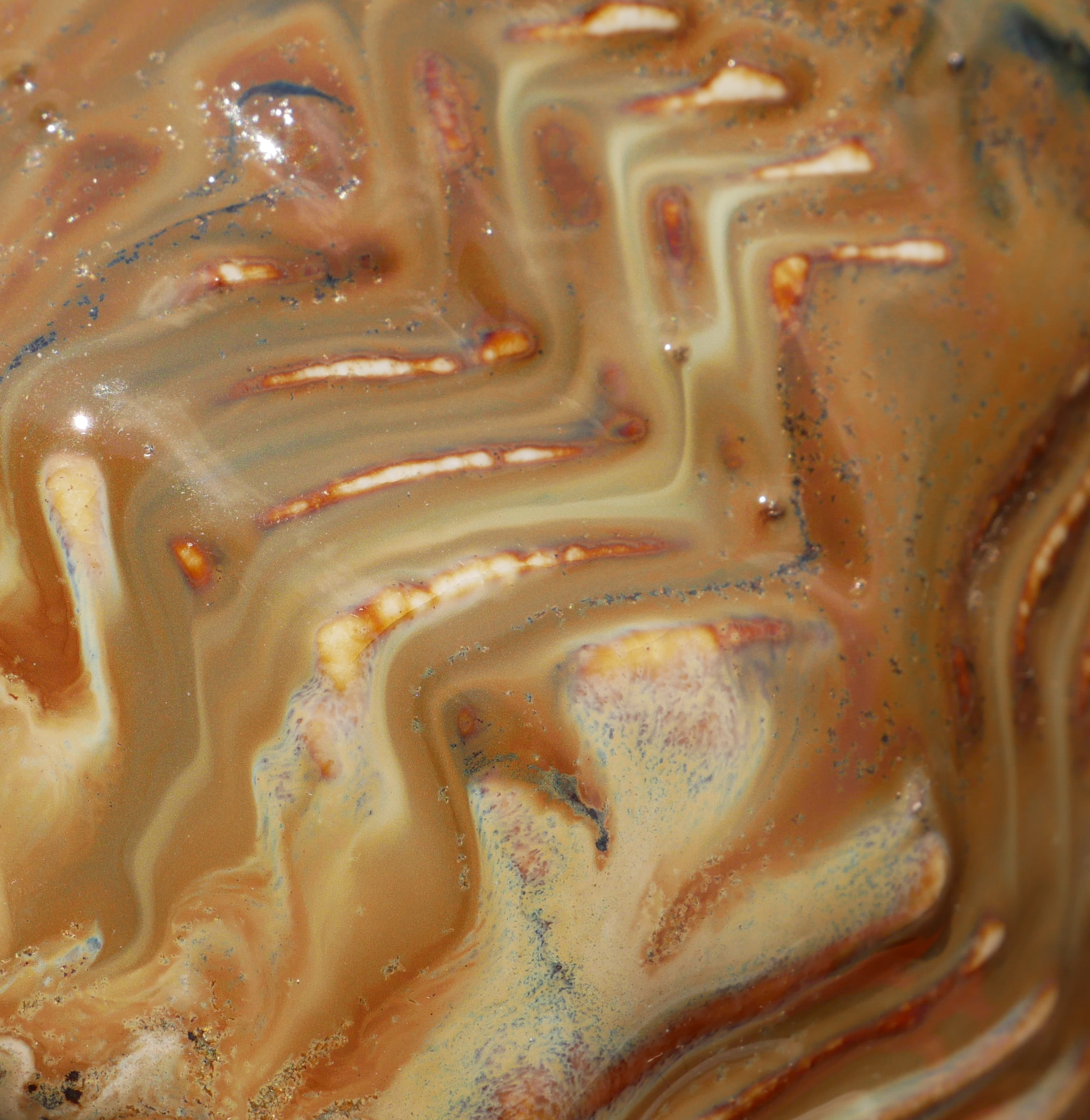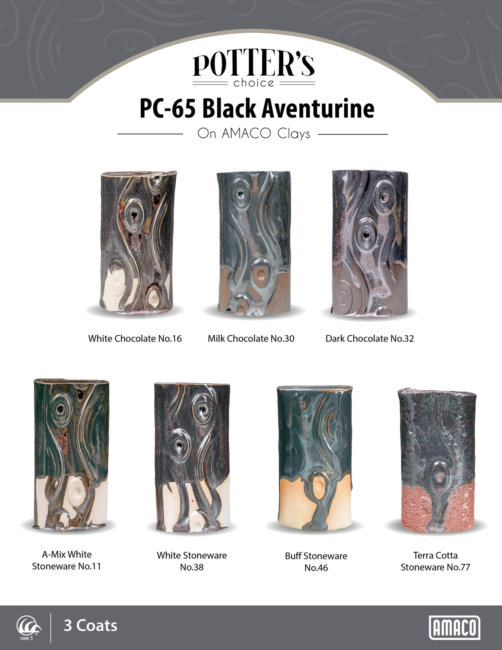 Black Aventurine is a fluid, rich black glaze that develops a metallic sparkle. If slow cooled, this glaze will grow crystals. The lighter test tile shown here is PC 56 Black Aventurine to PCF 33 Mystic Tide fired at Cone 6.