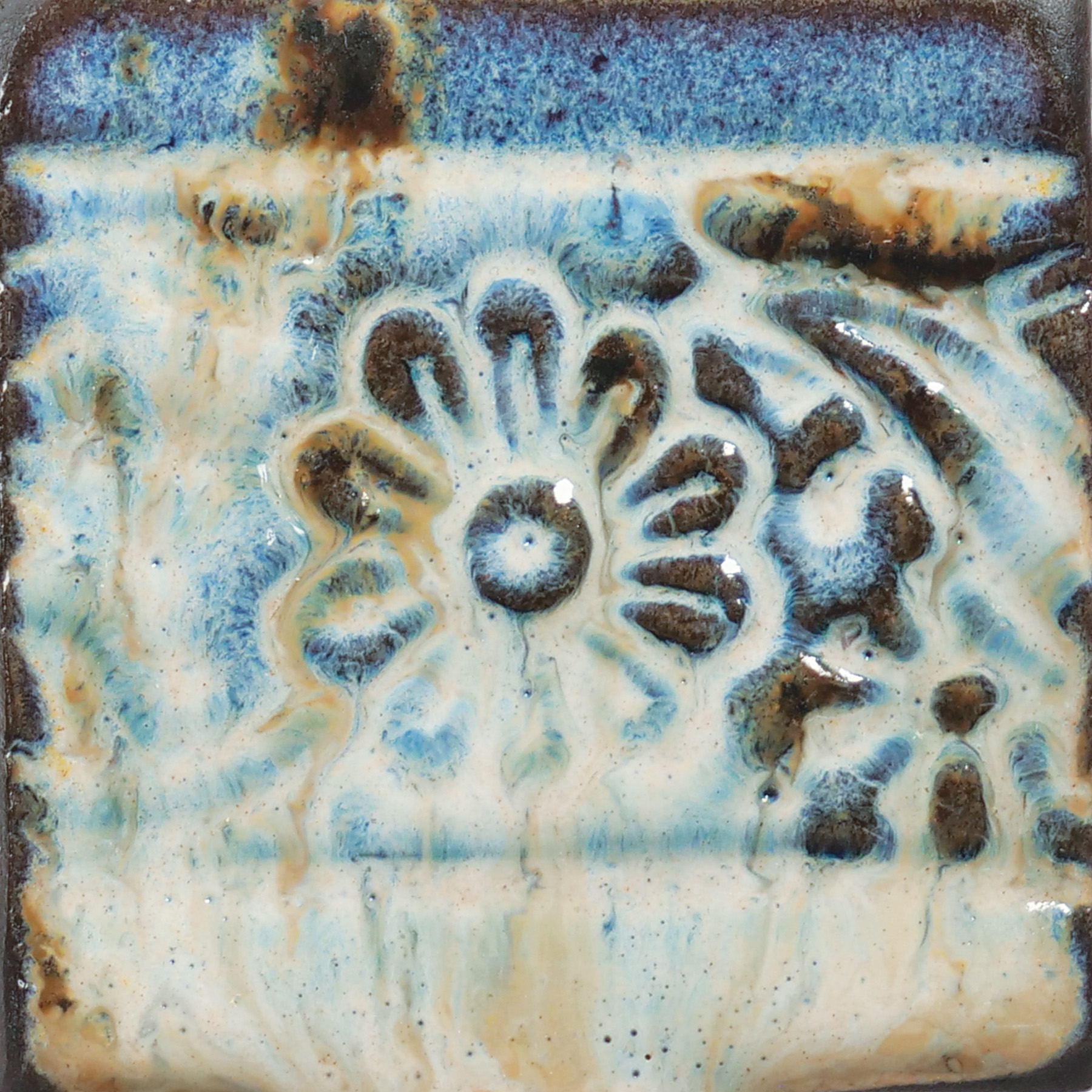 PCF-74 River Birch is a glossy cream glaze with runny dark specks like the bark of a tree. River Birch breaks across textured surfaces and develops a peachy float when thick. Great for layering with other glazes as a base or top coat.