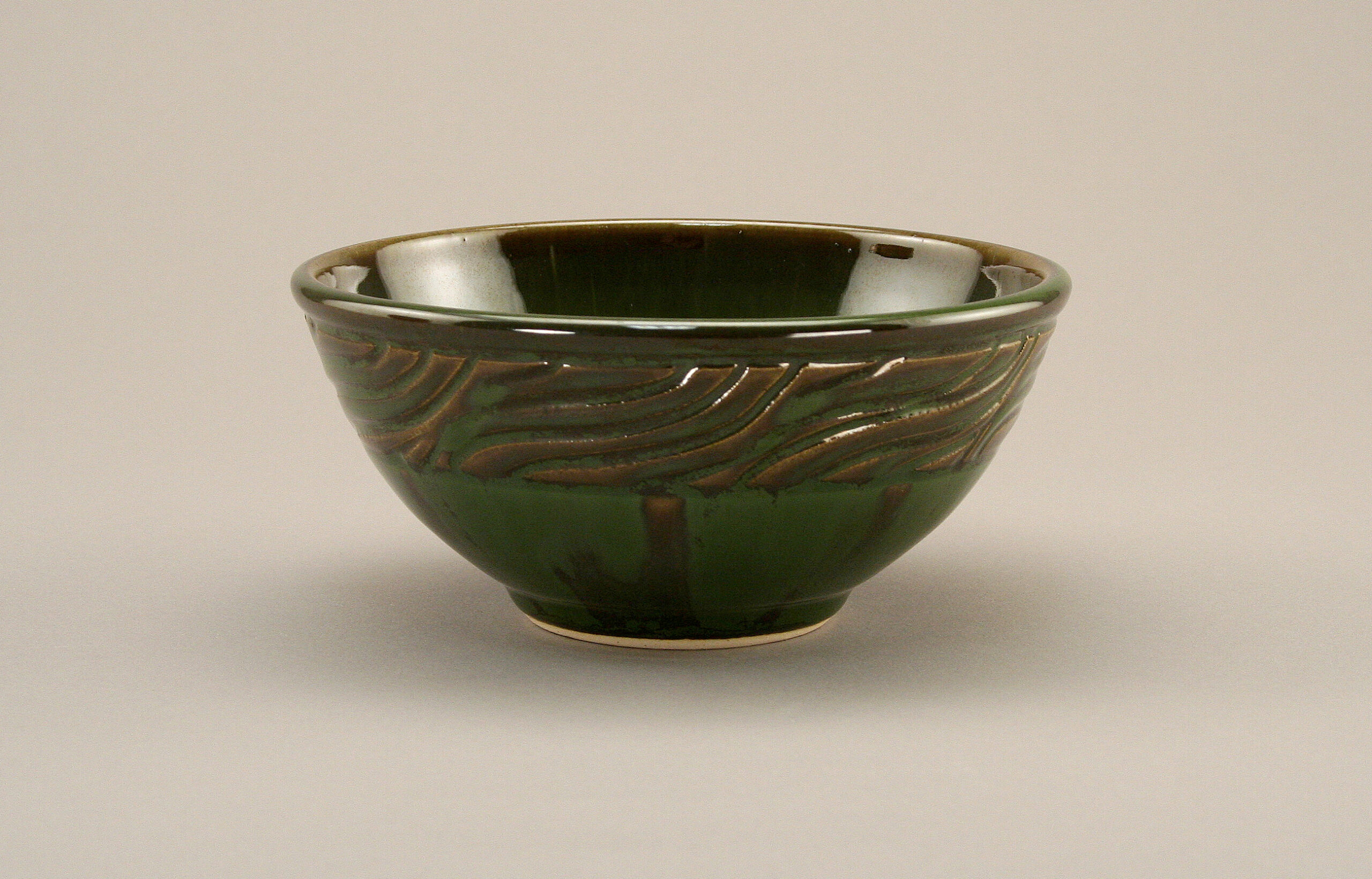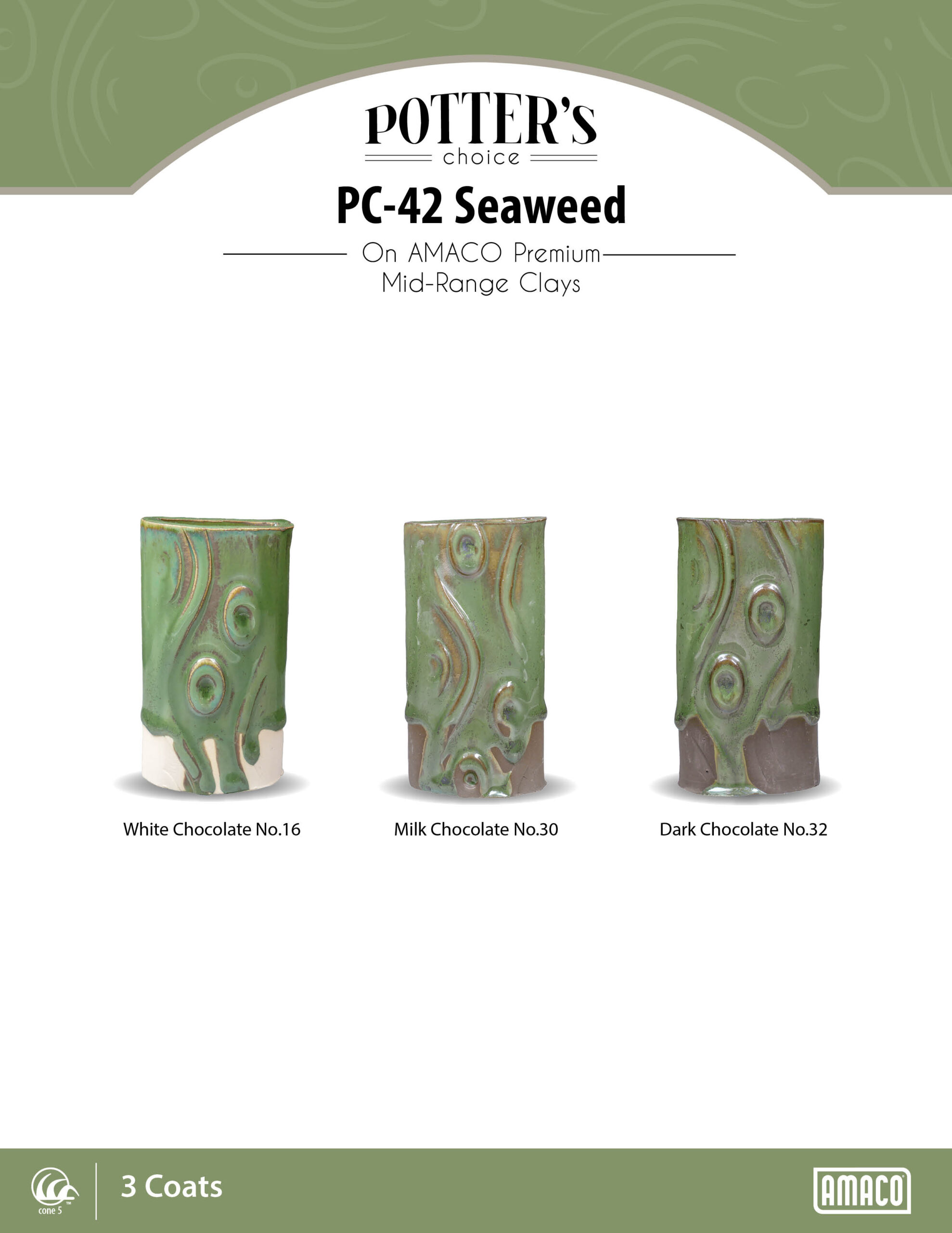 Seaweed is a fluid, deep green glaze that layers beautifully with a variety of Potter’s Choice glazes. This glaze breaks brownish over texture and becomes more fluid with thickness. Pay attention to application thickness so the glaze does not flow onto kiln shelves during firing. The long dish shown here is Seaweed layered with Iron Stone.