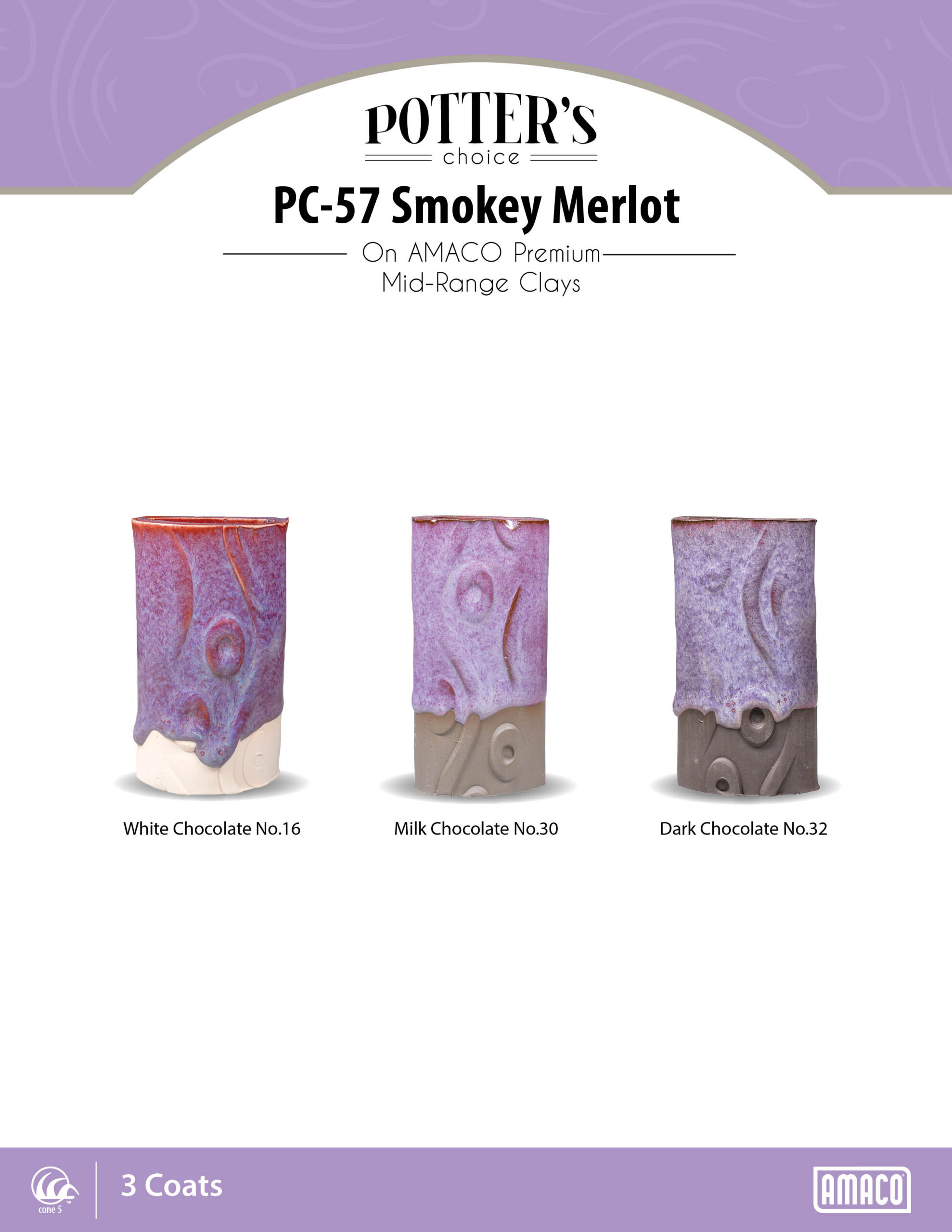 Smokey Merlot is a warm, dark purple glaze with a soft float of lilac over the surface. This glaze looks stunning on smooth surfaces, over textured surfaces, and layered with our other Potters Choice glazes.