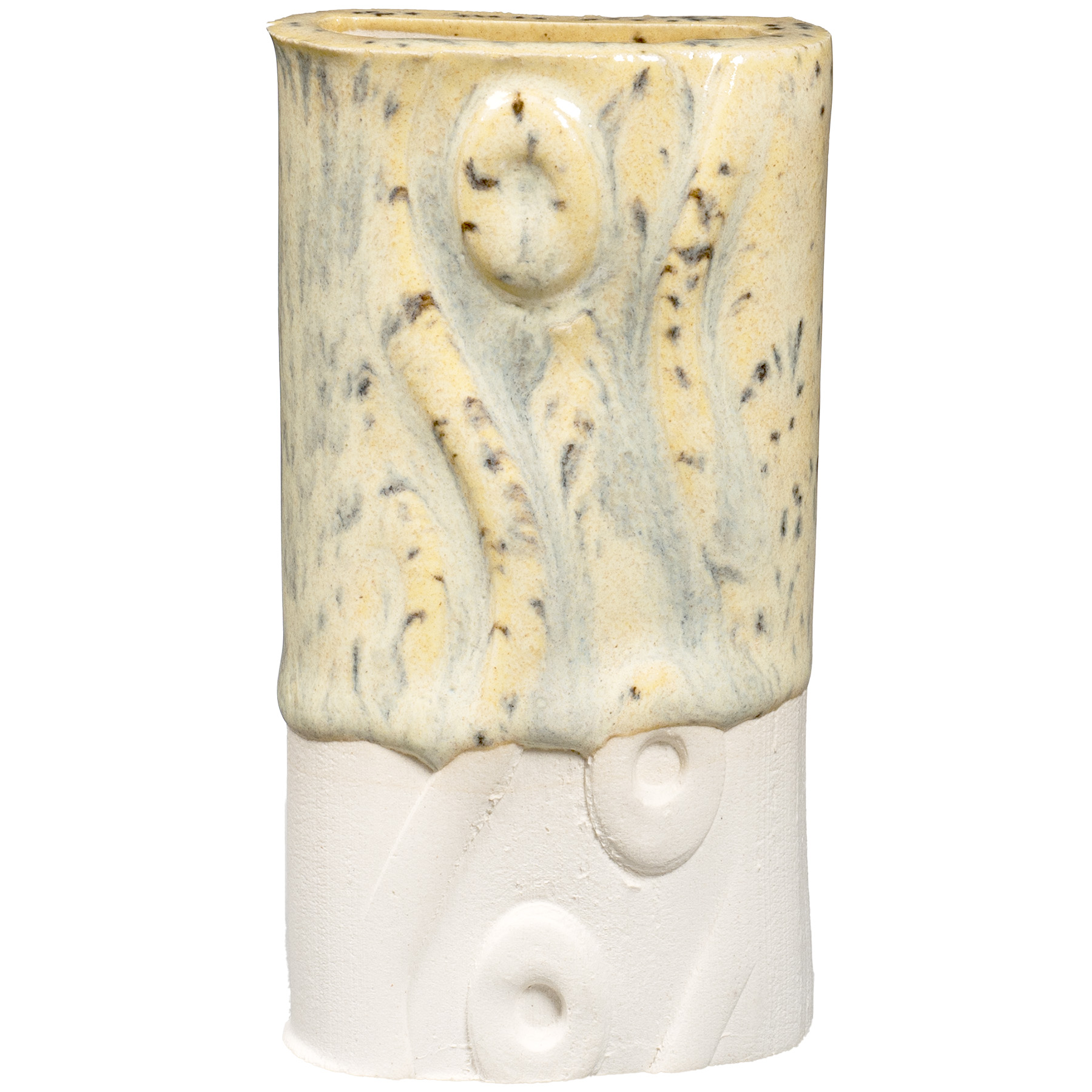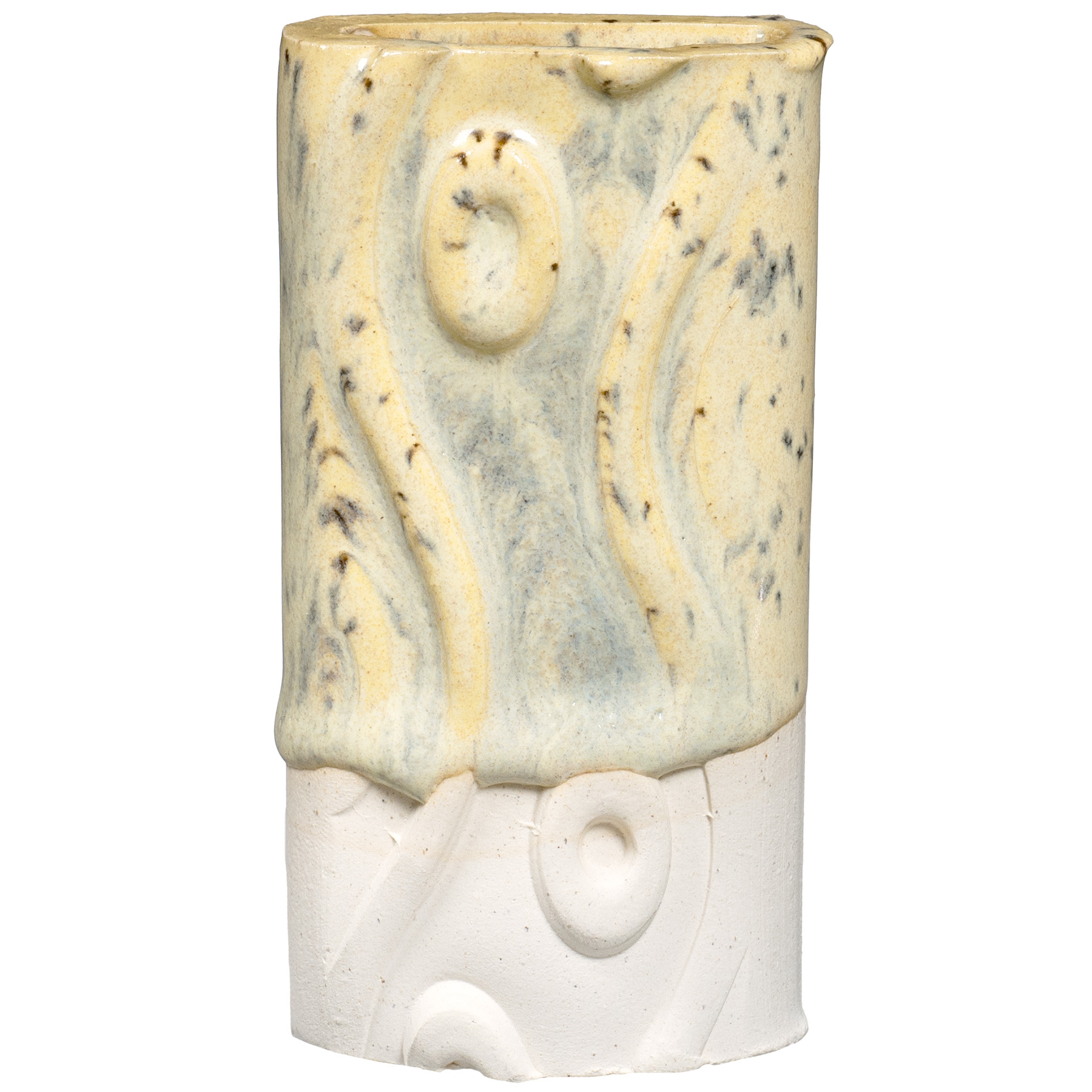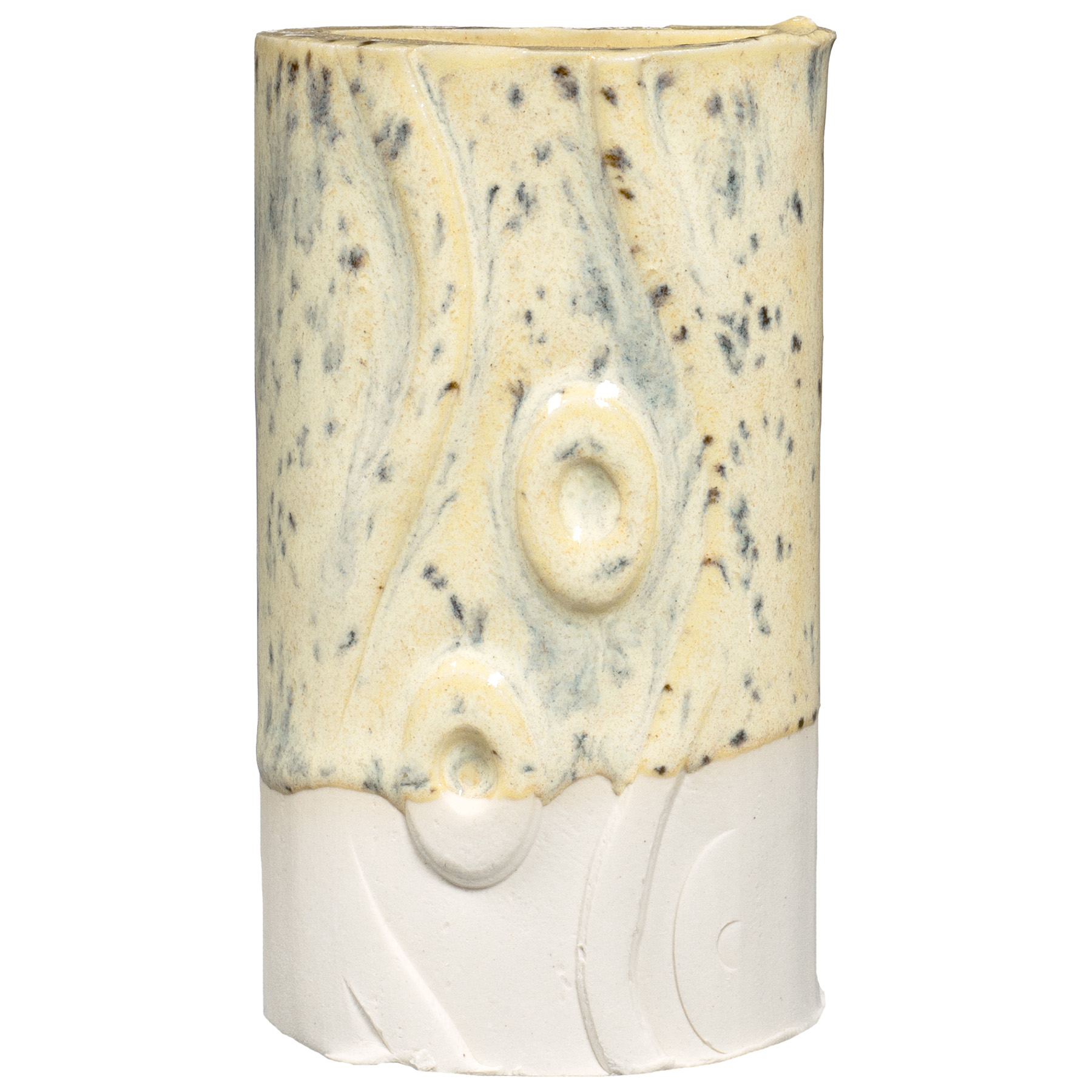 PCF-63 Sun Shower is a pale yellow interspersed with fine, dark speckles. It breaks across textured surfaces and develops a warm blush float when thick. Great for layering with other glazes as a base or top coat.