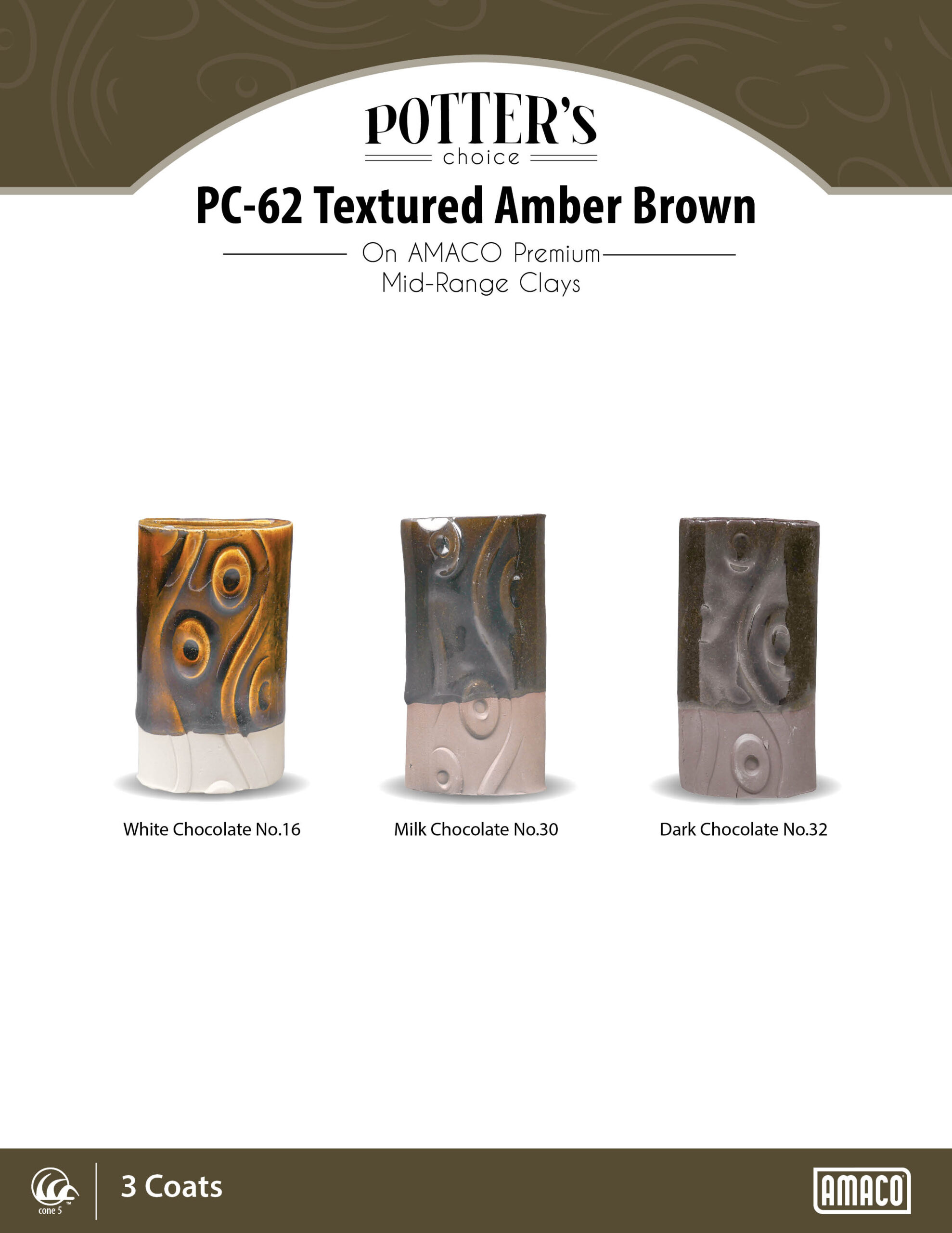 Textured Amber Brown is a glossy brown glaze that breaks lighter where thinner like a traditional temmoku glaze. This glaze layers well with our other Potter’s Choice glazes and produces fluid, beautiful effects.